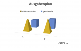 Der Ausgabenplan beschreibt die Entwicklung der finanziellen Mittel, die bei risiko-optimierter Planung für Ausgaben zur Finanzierung des Lebensstandards zur Verfügung stehen. Dabei werden alle finanziellen Aspekte wie Steuern, Sozialabgaben oder andere obligatorische Abgaben automatisch berechnet und berücksichtigt. Dem Plan werden die gewünschten Mittel zur Finanzierung des Lebensstandards gegenübergestellt, um zu erkennen, wo Lücken oder Überschüsse auftreten. Je höher die finanzierbaren Ausgaben, um so höher der erreichbare Lebensstandard.