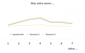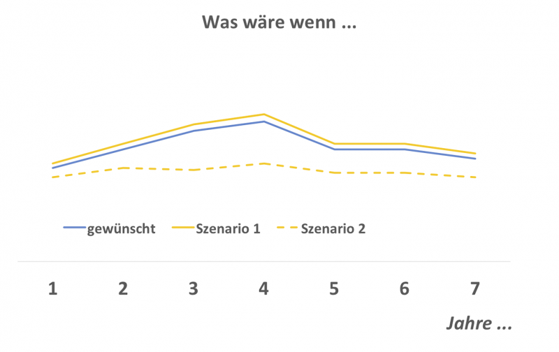 Mit Hilfe von Szenarien lassen sich spezielle Risikofälle genauer untersuchen. Besteht z.B. hohe Unsicherheit über die Einkommensentwicklung, so lässt sich für unterschiedliche Einkommenspfade berechnen, wie sich dies auf den Lebensstandard niederschlagen würde.