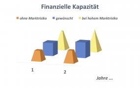 Die “Finanzielle Kapazität” zeigt an, ob ein gewünschter Lebensstandard überhaupt finanzierbar wäre. Liegen die für den anvisierten Lebensstandard benötigten Ausgaben zwischen den geplanten Ausgaben “ohne Marktrisiko” und der Planung mit “hohem Marktrisiko”, dann können diese Wünsche als möglich angesehen werden. Sie liegen innerhalb der finanziellen Kapazität.