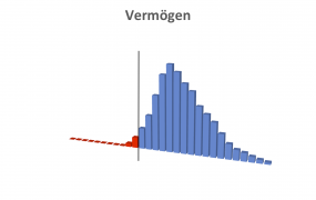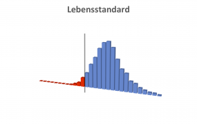 Das Eingehen von Marktrisiko (z.B. durch Investitionen in Aktien) führt zu Unsicherheit über den zukünftigen Lebensstandard. Um das Ausmass dieses Risikos zu verdeutlichen berechnet LFS+, mit welcher Wahrscheinlichkeit kritische Schranken im Lebensstandard unterschritten werden. Diese Angaben werden grafisch in einem sogenannten Histogramm dargestellt.